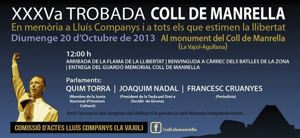 Al 1939 van passar camí de l’exili unes 50.000 persones pel Coll de Manrella, al terme municipal d’Agullana. Entre aquelles persones hi havia els presidents de Catalunya i del País Basc, Lluís Companys i Jose Antonio Aguirre. Al 1979 s’hi alçà un monument commemoratiu. Al mes d’octubre s’hi fa cada any una trobada i un homenatge al president Companys. Demà diumenge 20 d'octubre s’arribarà a la XXXVa edició organitzada per la Comissió d’Actes Lluís Companys de La Vajol.