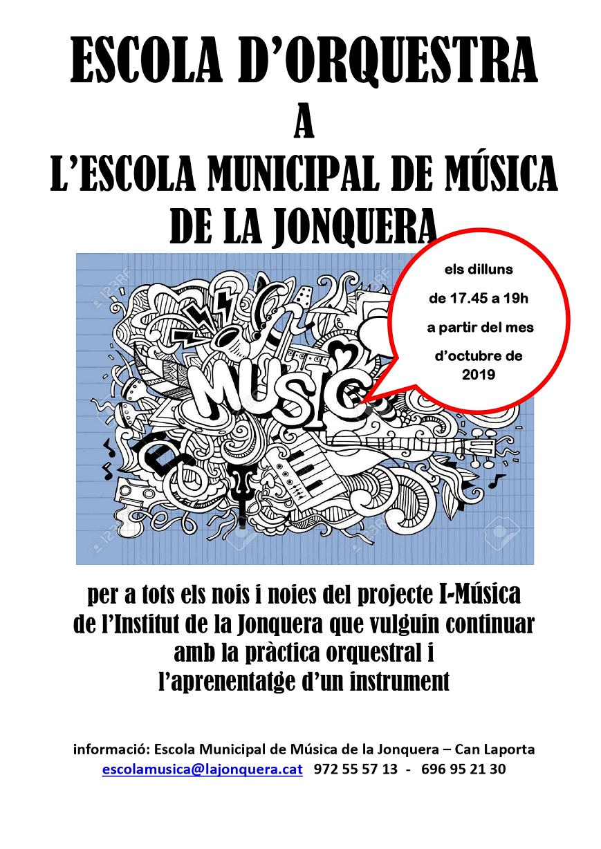 L'Escola d'Orquestra està destinada als mateixos alumnes de l'institut que tenen ganes de continuar practicant l'instrument que han après a tocar al centre. Ho podran fer a l'Escola Municipal de Música (Can Laporta) cada dilluns, de 17.45 h a 19.00 h. Les inscripcions es poden formalitzar trucant als telèfons 972 55 57 13 o 696 95 21 30, o bé enviant un correu electrònic a l'adreça escolamusica@lajonquera.cat.