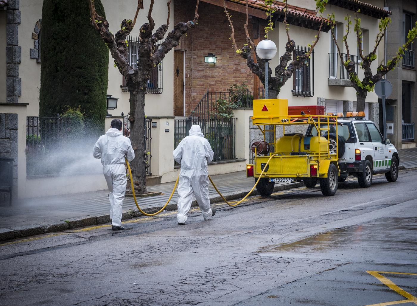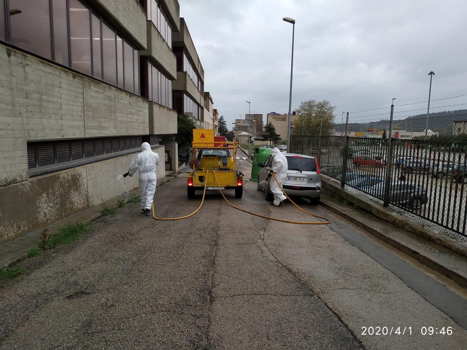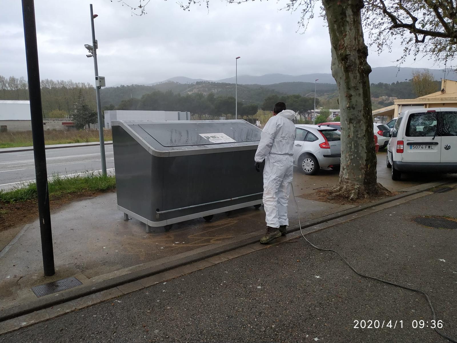 La brigada municipal ruixa els punts més concorreguts amb una solució d'hipoclorit sòdic diluït amb aigua