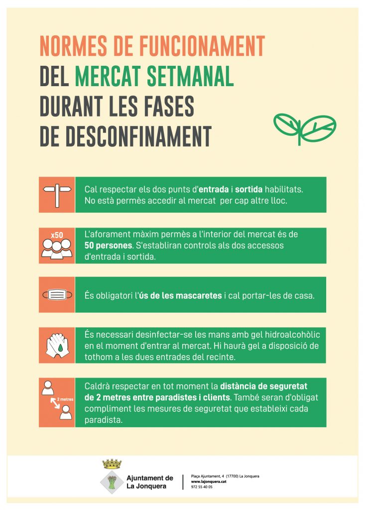 En primer lloc, només es podrà entrar i sortir de la zona del mercat per dos punts habilitats que se senyalitzaran perquè tothom els pugui detectar, però no s'hi podrà accedir per cap altre lloc. I en aquests dos punts s'hi habilitaran controls perquè es limitarà l'aforament a un màxim de 50 persones. A més, els clients hauran de portar mascaretes, d'ús obligat, de casa. I en el moment d'entrar al mercat s'hauran de desinfectar les mans amb gel hidroalcohòlic que sí que hi haurà a les dues entrades. Per últim, serà obligatori respectar en tot moment la distància de seguretat de dos metres entre paradistes i clients, així com complir amb les mesures de seguretat que estableixi cada venedor.