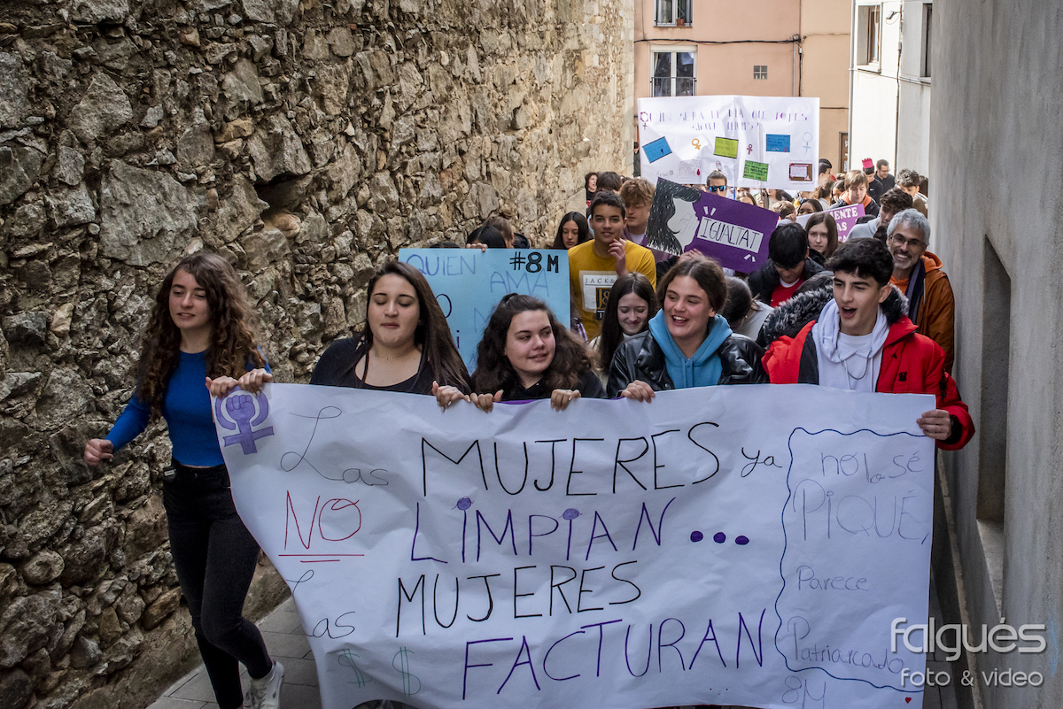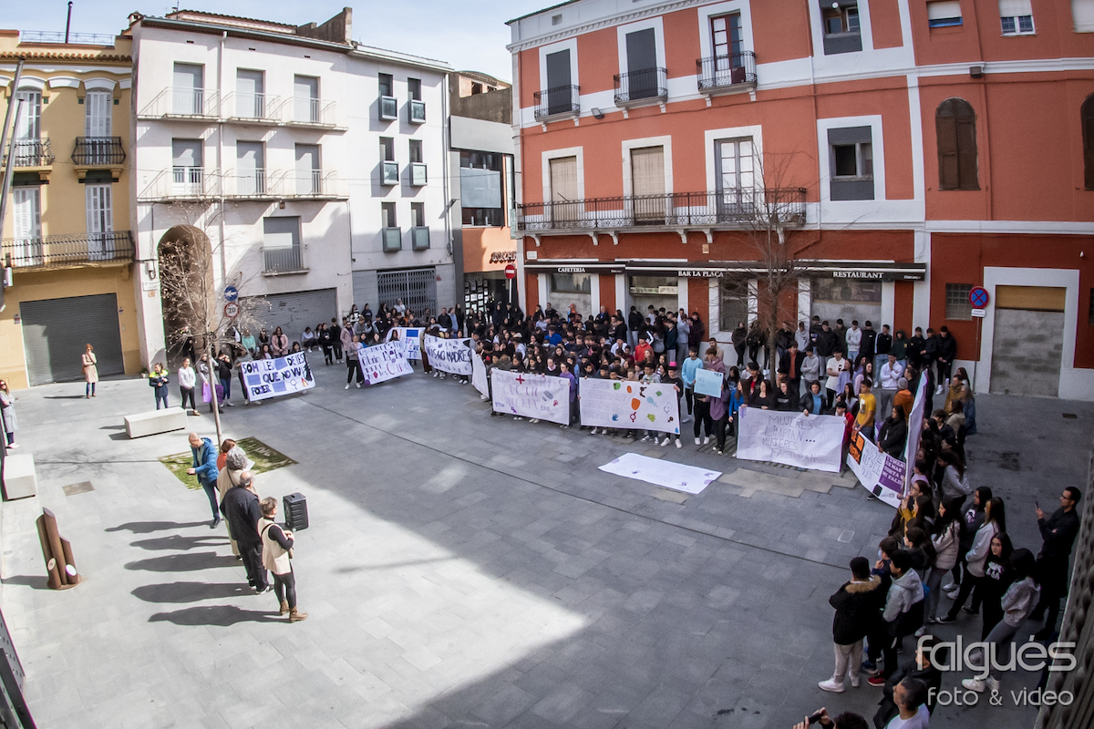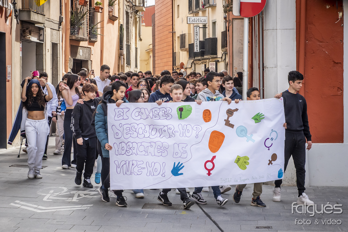 Desenes de joves de l’Institut de la Jonquera van sortir ahir al matí al carrer per reivindicar el Dia de la Dona Treballadora. Escudats amb pancartes on s’hi podien llegir diversos lemes contra les discriminacions de gènere i a favor de la igualtat, els nois i noies van fer una marxa fins a la plaça de l’Ajuntament, on a les 14 h es va fer la lectura del manifest institucional del 8-M.