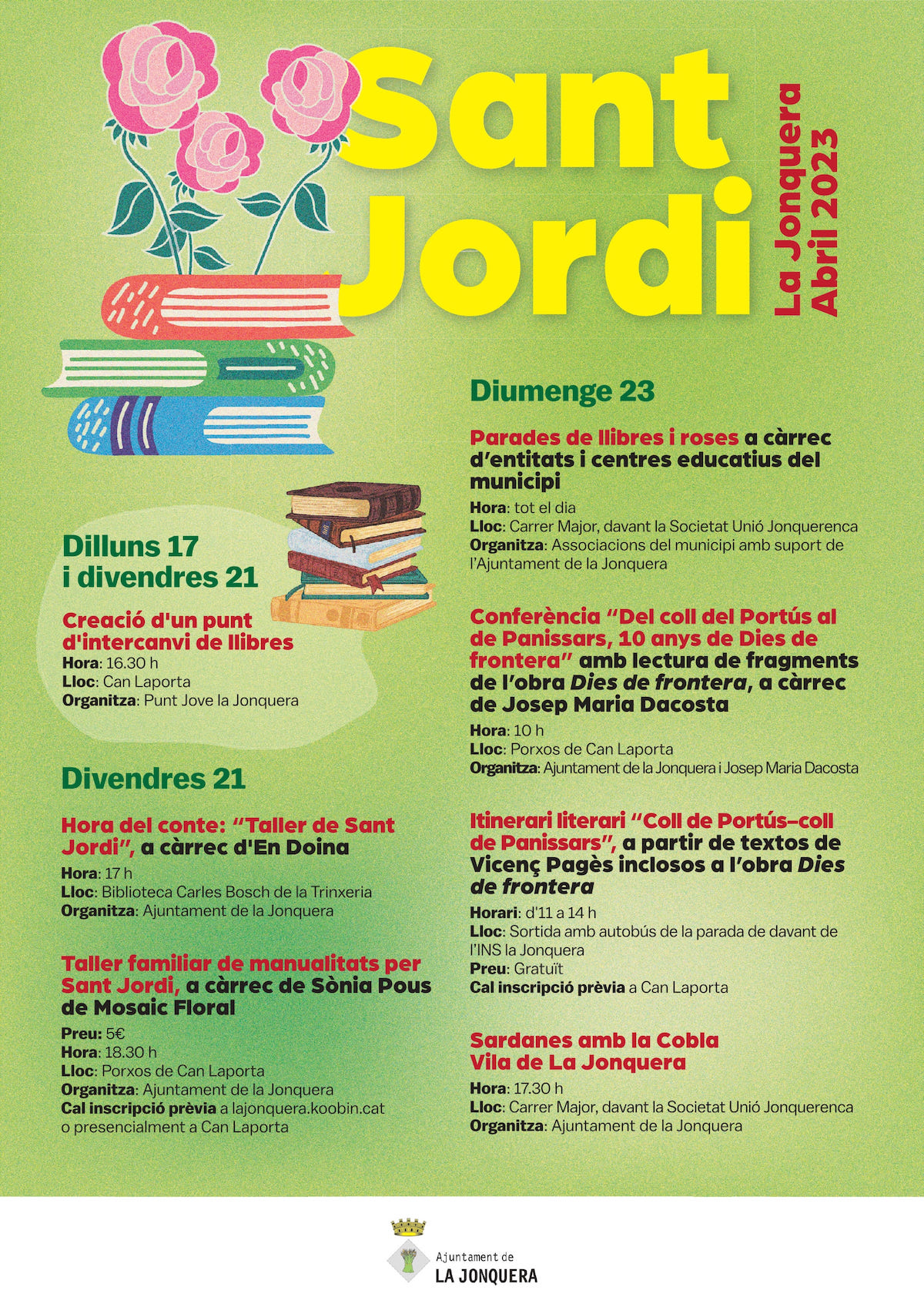 Això no obstant, els plats forts de la programació seran el diumenge 23, diada de Sant Jordi. Durant tot el dia s’instal·laran parades de llibres i roses a càrrec de les entitats i els centres educatius del municipi. Concretament, es col·locaran al carrer Major, a davant la Societat. Al llarg del matí s’han organitzat dues activitats al voltant de l’obra Dies de frontera. En primer lloc, una conferència anomenada “Del coll del Portús al Panissars, 10 anys de Dies de frontera”, a càrrec de Josep Maria Dacosta. Serà a les 10 h als Porxos de Can Laporta. Més tard, a les 11 h, s’ha planificat un itinerari literari “Coll de Portús – Coll de Panissars”. Serà un recorregut a peu de la Jonquera al Portús i d’allà al castell. Per arribar fins al punt d’inici del trajecte s’ha programat un autobús, que sortirà des de la parada de davant l’institut de la Jonquera. Totes les persones interessades a participar d’aquest itinerari literari gratuït cal que s’inscriguin prèviament a Can Laporta.