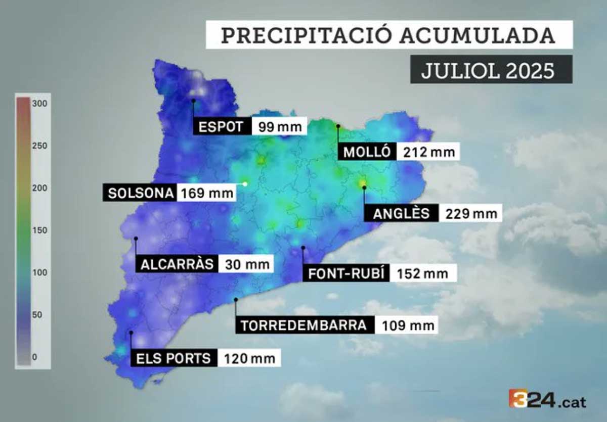 Els episodis de precipitació més destacats es van concentrar en poques jornades, com el 5 i 6 de juliol al nord-est, amb 123,2 mm en un sol dia a Anglès (la Selva); el 12 de juliol, amb tempestes generalitzades pel pas d’una DANA; i el 25 de juliol, amb una tempesta forta amb pedra i ventades a zones com el Maresme. El Pirineu occidental ha estat una excepció, amb un juliol sec o per sota del normal.