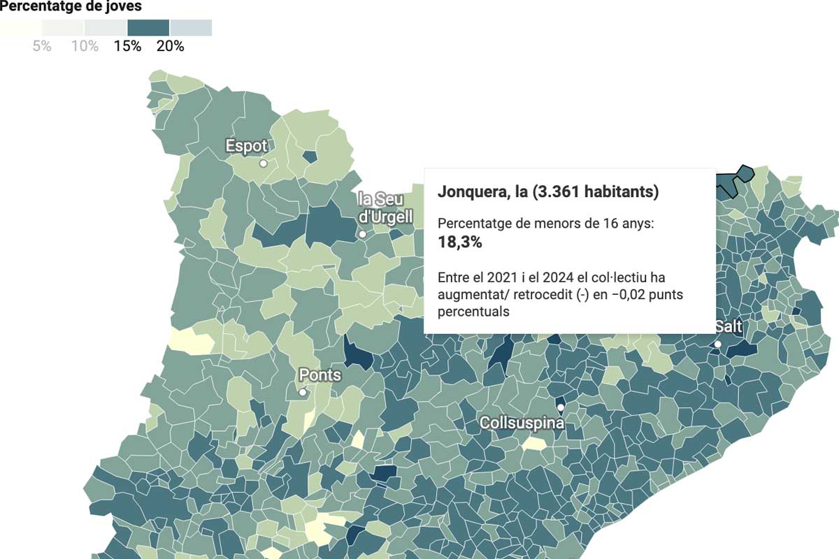 En l'àmbit municipal, el percentatge de menors de 16 anys ha caigut en el 74,4% dels municipis catalans des del 2021, és a dir, en 705 localitats. Entre aquests hi ha els 64 municipis més poblats del país (a Barcelona, per exemple, cau 0,7 punts el percentatge de jovent).