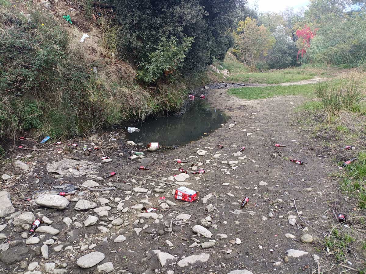 Nova mostra d’incivisme al riu Llobregat d’Empordà, al seu pas per la Jonquera. Aquest dimarts s’hi van poder veure nombroses botelles i packs de cervesa ja consumides i abocades directament al llit del riu, convertint-lo, un cop més, en un autèntic abocador a cel obert o en una mena de claveguera sense aigua que tot ho engoleix. Davant d’aquest panorama, la pregunta torna a ser inevitable: què cal fer per posar fi a tant d’incivisme? Instal·lar més càmeres? Perseguir els autors?