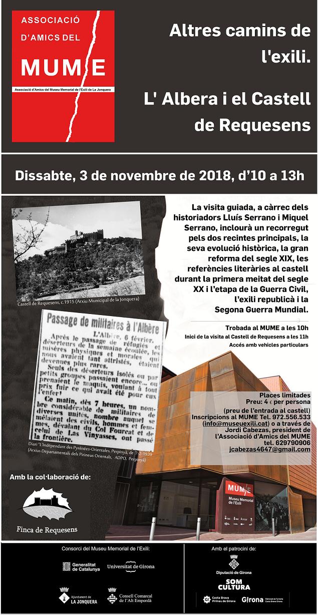 En el marc del programa Altres camins de l'exili, l'Associació d'Amics del Museu Memorial de l'Exili de la Jonquera (MUME) ha organitzat per al proper 3 de novembre una visita guiada per l'Albera i el castell de Requesens. El punt de trobada és el mateix museu a les 10 del matí, i està previst que l'activitat en sí comenci cap a les 11 h i s'allargi un parell d'hores.
